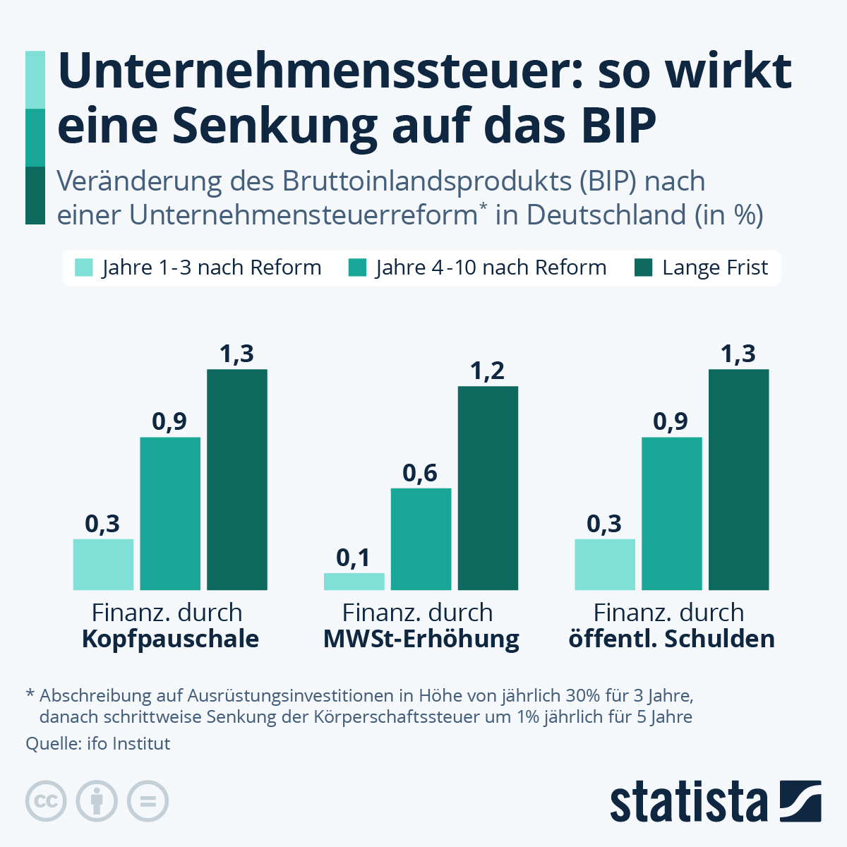 In Deutschland gibt es bereits Pläne seitens der Bundesregierung, die im Ländervergleich relativ hohen Steuern auf Unternehmensgewinne zu senken. Wie würde sich eine solche Reform auf die deutsche Wirtschaft auswirken? Wie eine gemeinsame Simulation (PDF-Download) des Ifo Instituts und des Sachverständigenrat zur Begutachtung der gesamtwirtschaftlichen Entwicklung ergeben hat, läge das reale Bruttoinlandsprodukt (BIP) in den ersten Jahren nach dieser Reform im Schnitt etwa 0,1 Prozent bis 0,3 Prozent über dem Status‑Quo. In der mittleren Frist (ab Jahr 4 bis Jahr 10 nach Einführung) erhöht sich das jährliche BIP‑Niveau laut Modell um etwa 0,6 Prozent bis 0,9 Prozent verglichen mit der Entwicklung ohne Reform. Langfristig beträgt der Zuwachs des BIP dauerhaft etwa 1,2 Prozent bis 1,3 Prozent gegenüber dem Referenzpfad ohne Reform. Auch andere volkswirtschaftliche Kennziffern würden sich nach Einschätzung der Experten positiv entwickeln: Neben dem BIP würden auch die privaten Investitionen, die Beschäftigung, die Lohnsumme und der private Konsum steigen.