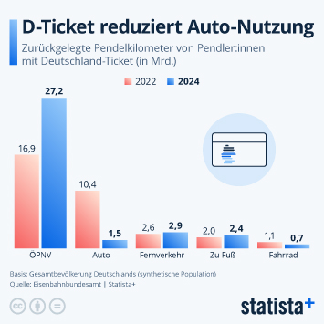 Wie stark sich das im Mai 2023 eingeführte D-Ticket ausgewirkt hat zeigt auch die Entwicklung der Pendelkosten pro Kilometer. Lagen diese 2022 im Öffentlichen Personennahverkehr (ÖPNV) bei 14 Cent waren es zwei Jahre später nur noch neun Cent. Dagegen sind die Kosten für Autopendler:innen leicht gestiegen, wie der Blick auf die Statista-Grafik zeigt. Dass Pendeln mit dem ÖPNV bezogen auf den Kilometerpreis billiger ist liegt unter anderem an den im Vergleich kürzeren Strecken. Absolut betrachtet ist das Fahrrad billiger.