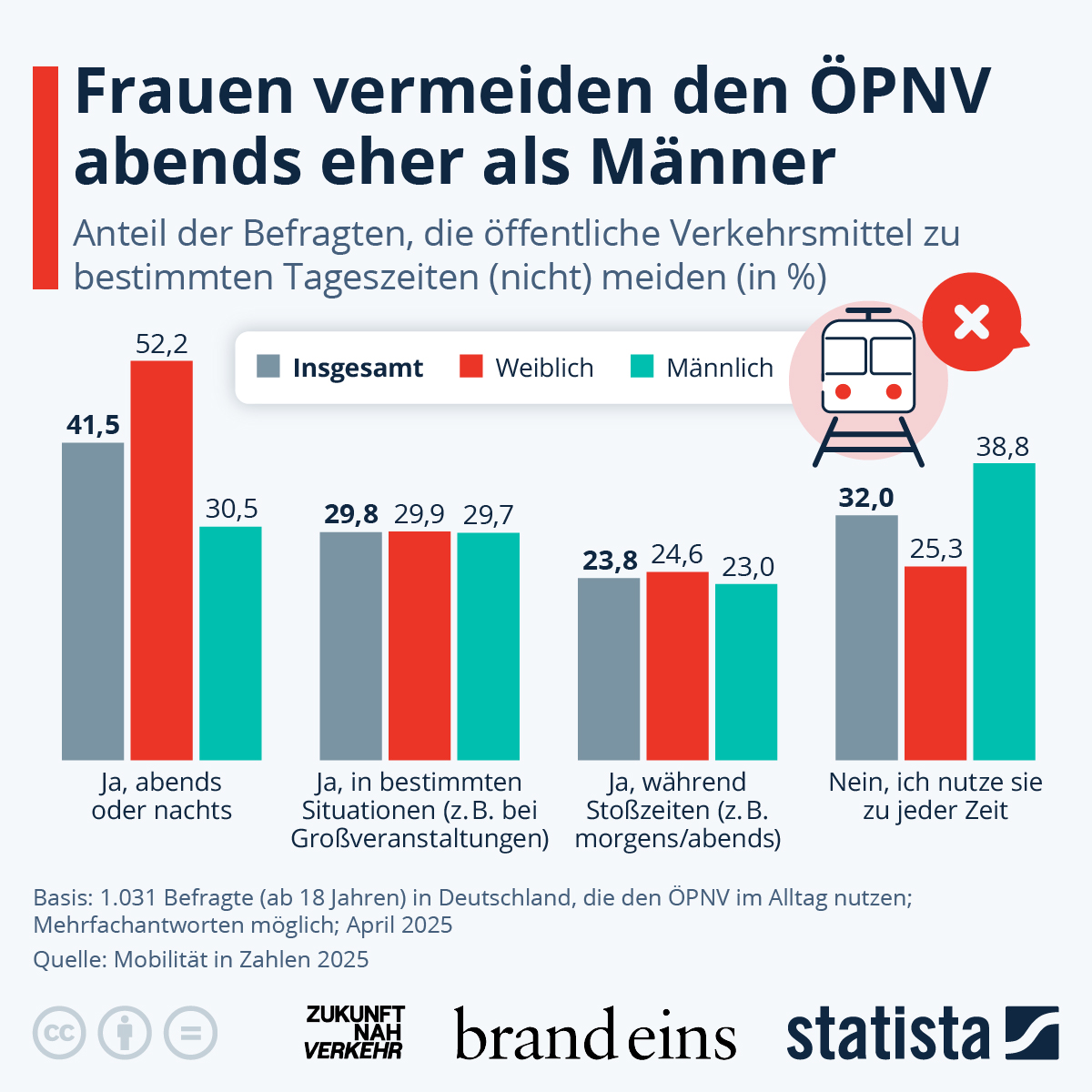 41 Prozent der Menschen in Deutschland nutzen den öffentlichen Nahverkehr in ihrem Alltag. Das geht aus einer Statista-Umfrage für den von brandeins und Zukunft Nahverkehr herausgegebenem Report "Mobilität in Zahlen 2025" hervor. Aber nicht alle von ihnen fühlen sich immer sicher in Bus und Bahn, das gilt besonders zu später Stunde. So sagen 41 der Befragten, dass sie den ÖPNV abends oder nachts meiden, bei Frauen sind es sogar mehr als die Hälfte. Aber auch Großveranstaltungen oder Stoßzeiten wirken auf viele abschreckend, wie der Blick auf die Statista-Grafik zeigt.